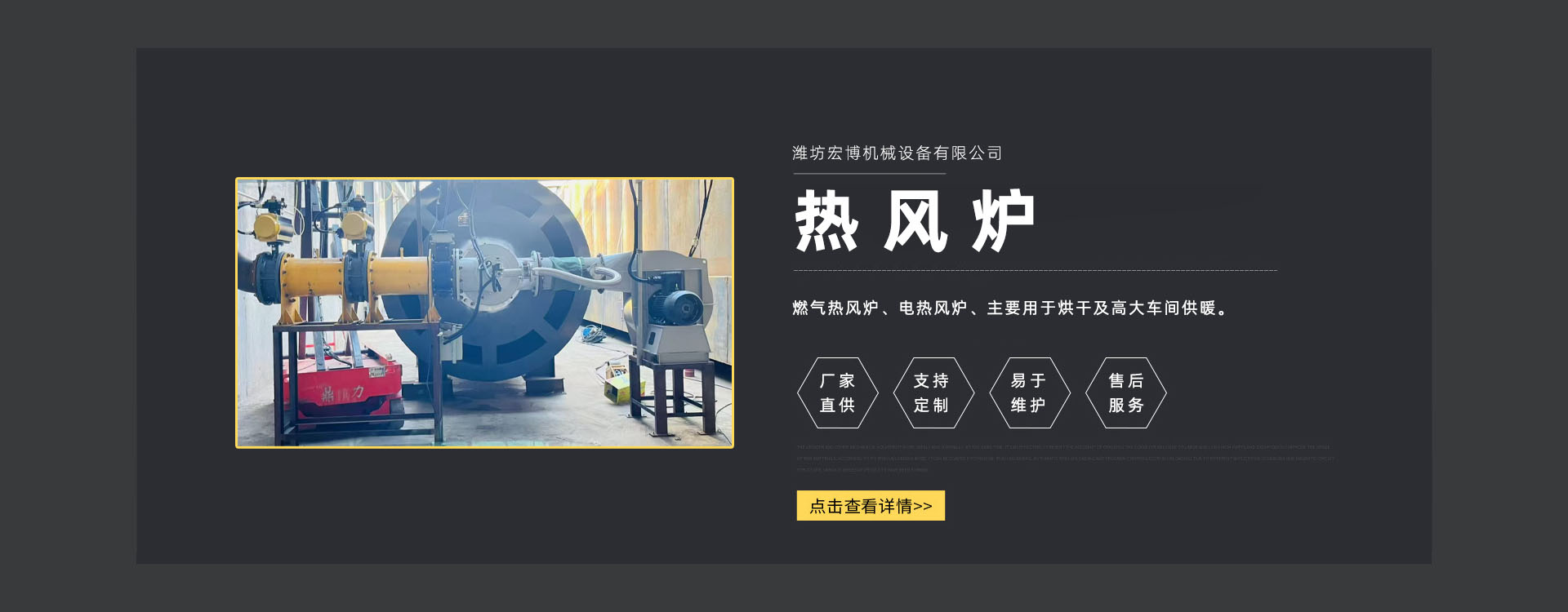 濰坊宏博機(jī)(jī)械設(shè)(shè)備有限公司是從事熱風(fēng)(fēng)爐、烘干設(shè)(shè)備、供暖設(shè)(shè)備的研發(fā)(fā)、設(shè)(shè)計(jì)、制造和服務(wù)(wù)于一體的實(shí)(shí)體企業(yè)(yè)。長(zhǎng)期以來,企業(yè)(yè)以市場(chǎng)的發(fā)(fā)展和客戶的需求為導(dǎo)(dǎo)向,集多年的生產(chǎn)(chǎn)技術(shù)(shù)與經(jīng)(jīng)驗(yàn)(yàn)為一體,不斷開發(fā)(fā)和優(yōu)(yōu)良產(chǎn)(chǎn)品。